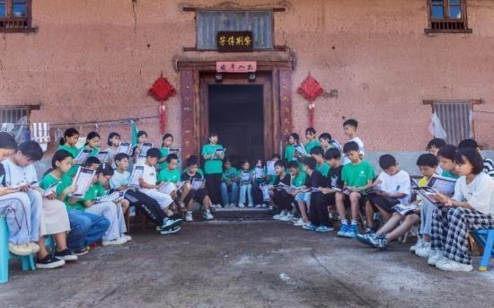 第一期夏令营,孩子们在瑶寨传统民居前学习国学。刘国忠摄近日集采优配,湖南江华瑶族自治县大圩镇崇江书院 “心光计划”困境儿童成长夏令营,迎来送往新、老两期学员。当日,湖南省妇女儿童发展基金会红妈妈基金、中国瑶族文化传承研究中心、该县民政局的相关负责人,携手书院全体老师和志愿者,与70余名新、老夏令营学员以及部分家长见证了这一温暖时刻。