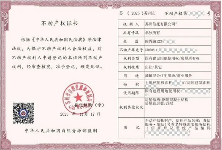 2025年11月,江苏省宣布将在南京市、苏州市两地开展不动产信托登记试点。随后,苏州完成了江苏省首单不动产信托财产登记。