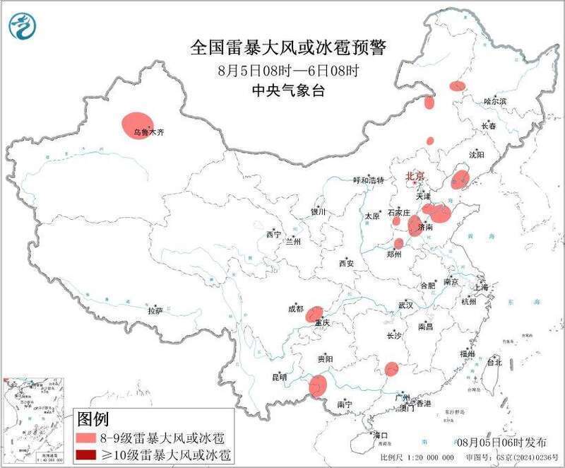 预计8月5日8时至6日8时,新疆西部、内蒙古东部、东北地区南部、华北南部、华中北部、华东北部、西南地区北部、华南西部和北部等地的部分地区将有8级以上雷暴大风或冰雹天气。